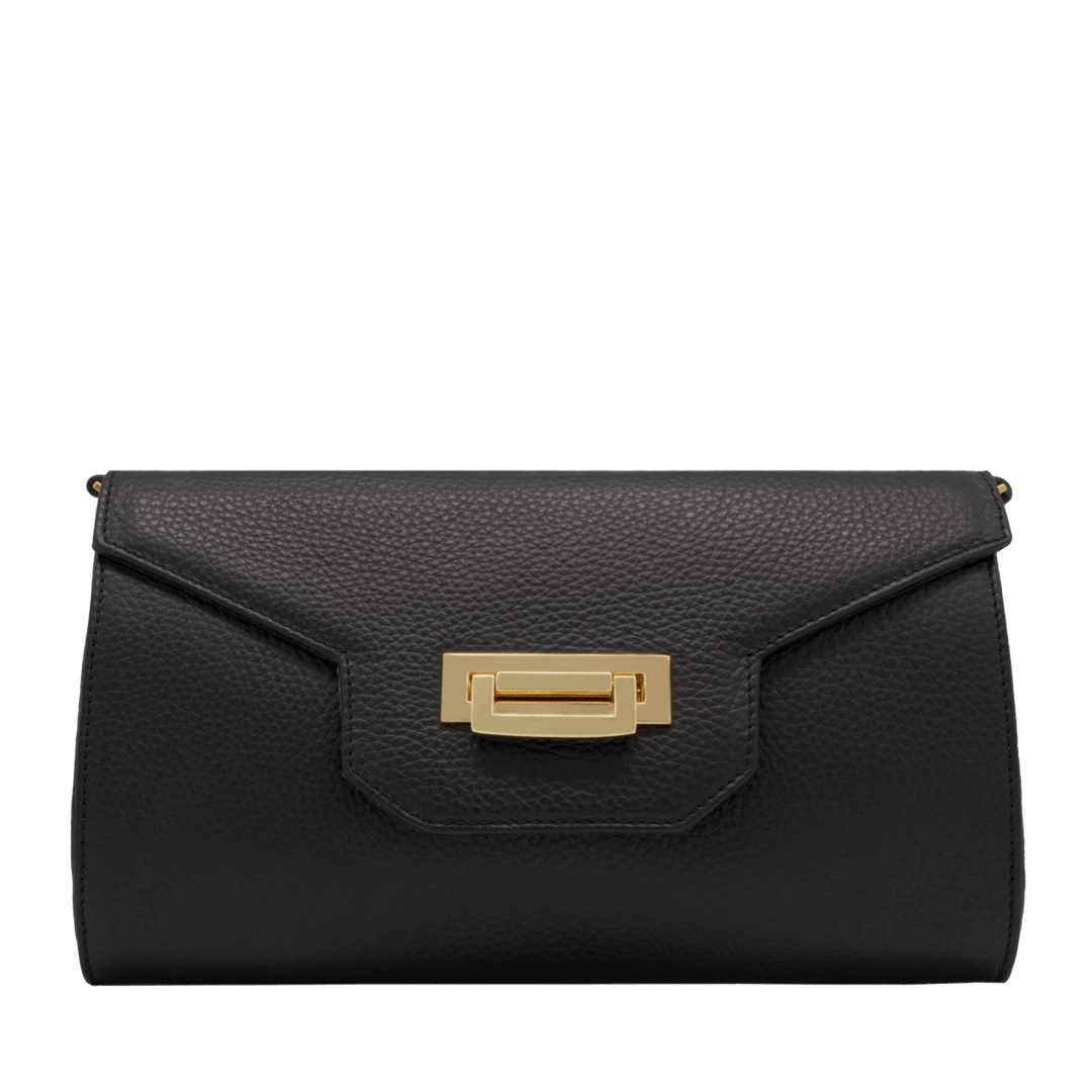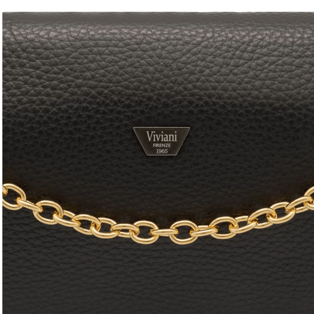 Womenโs clutch with detachable metal chain shoulder strap, handmade in โalceโ style calf leather, small and elegant, suitable for evening and formal wear.